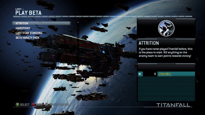 β版では、チームデスマッチの「Attrition」、いわゆるDominationにあたる「Hardpoint」、最初からタイタンに乗っており、チームに分かれてタイタン同士のガチ戦を楽しむ「Last Standing Titane」(最後まで生き残ったタイタンがいるチームの勝ち)、そして上記のゲームの中からランダムで選ばれる「Beta Variety Pack」のプレイモードが提供されていました。