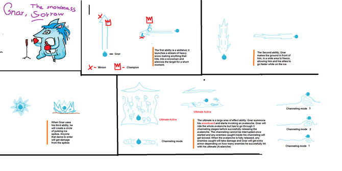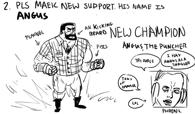 Riot Gamesがこれらのアイデアを基に開発しているかどうか定かではありませんが、以前追加された新サポートチャンピオン「Braum」も、過去にユーザーから提案されたパンチ力が自慢の男らしいオリジナルサポートチャンピオン「Angus: The Puncher」と似通ったテーマで制作されていました。新チャンピオンの登場を楽しみにしているユーザーは、「Gnar, The Snowmass Sorrow」のアイデアスケッチもチェックしつつ期待しましょう。