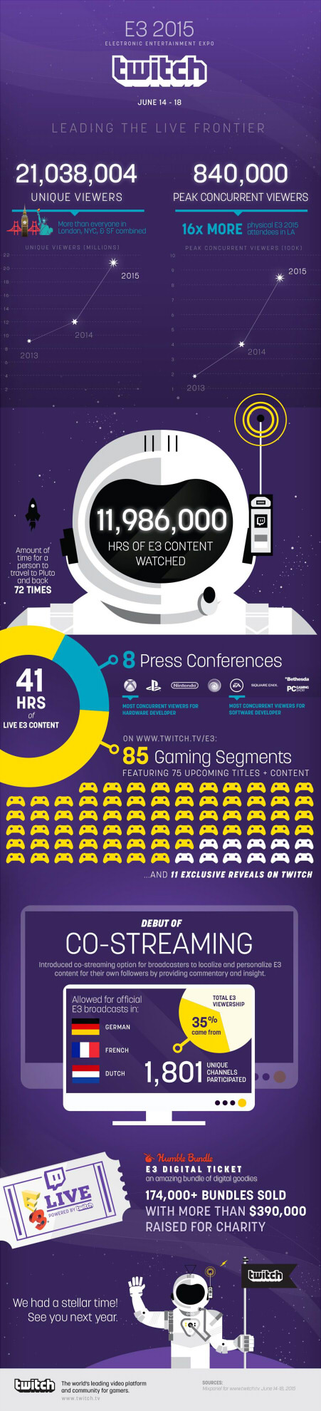 - 41時間に及ぶライブコンテンツでは、Microsoft、SCE、任天堂、Ubisoft、Electronic Arts、スクウェア・エニックス、Bethesda Softworks、PC Gaming Showの8つのプレスカンファレスが実施