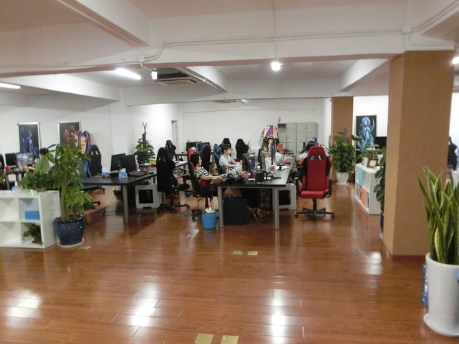 ImbaTVオフィスは10階建てほどの中層ビルにあります。使っているのは真ん中あたりの上下2階。ここで約50名が働いているそうです。まず上の階に行ってみると、『Hearthstone』と『Dota 2』のキャラクターの大きなイラストが目に飛び込んできました。仕事場を囲むようにして、大広間の壁面にそれらのイラストがズラリと並んでいます。この仕事場はゆうに30名は入れそうな広さですが、夜間に来たのでオフィスに残っている社員は15名ほどでした。
