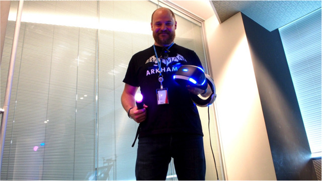 体験できたのは、バットマンに変身する流れが体験できるデモと、バットマンとして殺人現場を捜査するデモの2種類です。操作は、左右のPS Moveモーションコントローラをバットマンの手に見立て、トリガーを使って物やガジェットをつかむことができます。移動は中央にあるMoveボタンを押してテレポートで行います。移動は3D酔いを無くすために簡単にする一方、両手のコントローラによる直感的な操作で辺りを調べられるので、作品への没入感は高くなっています。