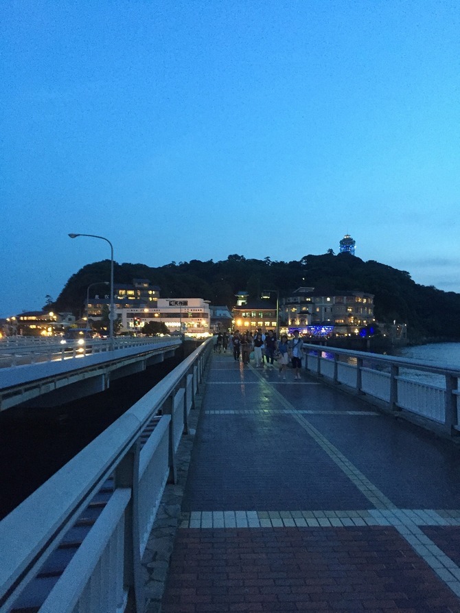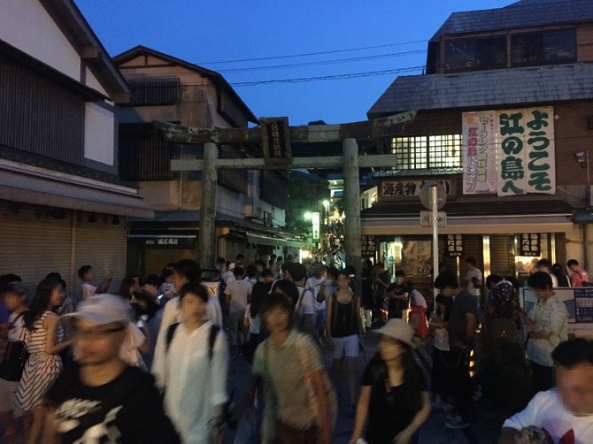 江ノ島に到着する頃には日が暮れていたが、それでも辺りには多くのトレーナーの姿があった。皆ラプラスの話をしている。出店のお兄ちゃんに「今日は人が多いですね」と尋ねると「みんなポケモンGOだよ」と即答。普段から人はいるが、トレーナーはスポットから移動しないため、普段以上に人だかりができるそうだ。遠くのほうでは「そこ!座らないでね!」というおばちゃんの声も聞こえてくる。邪魔にならないようプレイしたいものだ。