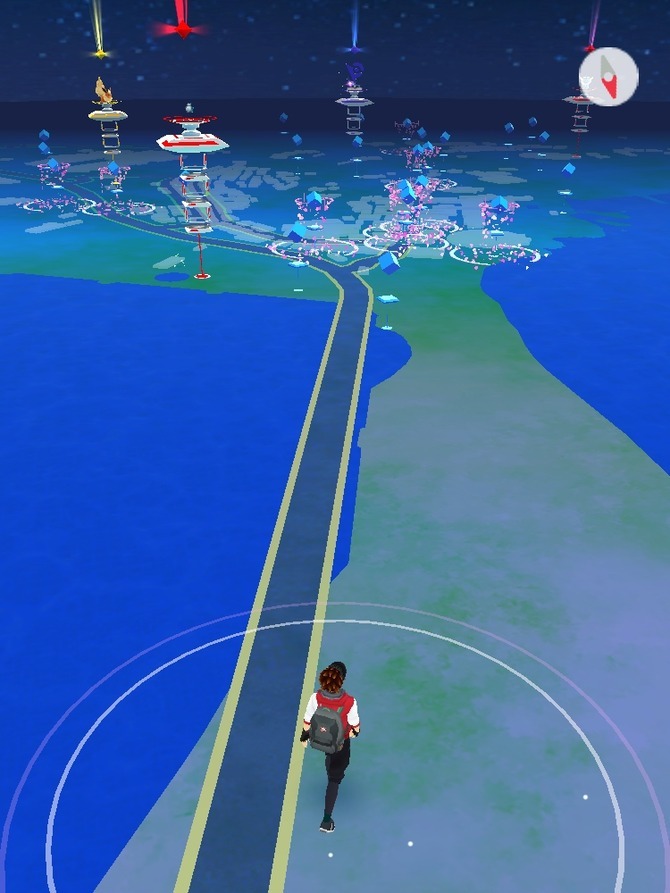 情報を見てから居ても立っても居られなくなった筆者は、実際に江ノ島に行ってみる事にした。とはいえ日中は暑く人も多そうなので、日が沈むころを狙った。7月24日18:45頃、最寄り駅から江ノ島を目指してみると、明らかに人が多いことに気が付いた。海岸を横目に江ノ島に近づいていくと、「ルアーモジュール」が使用されているスポットが表示されるようになり、多くの人とすれ違う。そして何度か訪れているはずの江ノ島が異世界のように見えてきた。冒険がはじまる――そう感じるほどに。