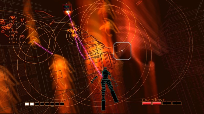 ピクセルの連なりのような自キャラが、ステージへ「log-in」すると、パーティクルで構成された世界へ突入。「プレイヤーはサイバースペースのハッカーとなり、ウィルスを倒す」というストーリー設定にあるとおり、サイバー空間へと飛び立つ。映画「トロン」の舞台やバンド「THE MAD CAPSULE MARKETS」後期のプロモーションビデオの中にいるような感覚がついに味わえた!と興奮を覚えながら、チュートリアルらしき序盤の敵をLスティック+×ボタンでロックオン&撃破。