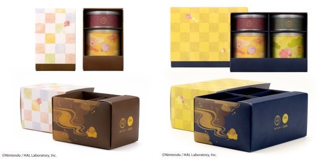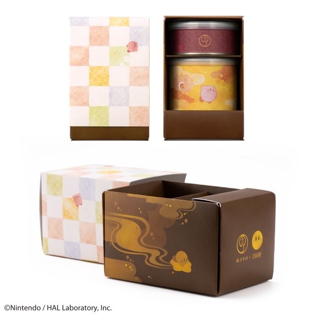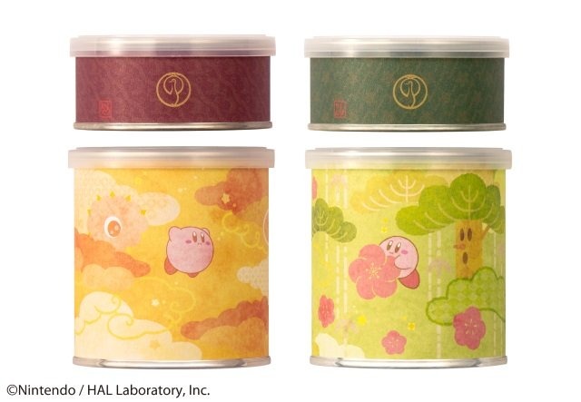 「はんなり、はなやかな和の世界にカービィがとびこんできたら?」そんなコンセプトでつくりあげた、「カービィのまんまる手づくり最中」だけのオリジナル和風デザインです。「小倉あん」缶のセットには、金色の空をふわふわとただようカービィを。「こしあん」缶のセットには、縁起のよい松竹梅をモチーフに和の世界を表現いたしました。1缶入・2缶入 外箱パッケージ