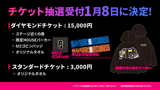 特典:ダイアモンドエリアの席、限定HOUSEパーカー、6ロゴピンバッジ、オリジナルタオル- スタンダードチケット 価格3,000円(税込)