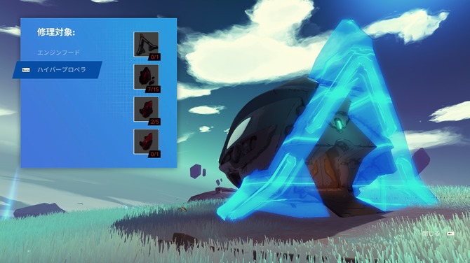 物語は、序盤に大破してしまった宇宙船「ネスト」修理のため、各島を探索して代替パーツ入手を大筋に進行していきます。ネストはこの惑星における2人の家であり、様々な作業を行う拠点ですね。