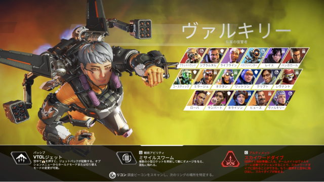 新レジェンド「ヴァルキリー」はトレイラーなどでも確認できる通り、飛行能力を持っています。ゲーム中ではパッシブアビリティ「VTOLジェット」として登場し、空中でジャンプボタンを押すと飛行モードへ変更。