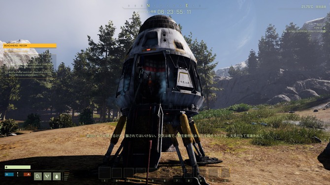 1stマップは難易度EASYのチュートリアルを兼ねた内容で、プレイヤーの目標は資源の採取と狩猟・建物の建築・携帯用寝具の作成。たったこれだけですがミッションの制限時間はゲーム内時間ではなく“リアルタイムの”7日に設定されています。この7日間は何をしても自由で、さっさと目標を終わらせポッドから再び宇宙ステーションに帰還し次のミッションに行くのも手ですが、資源収集、大豪邸の建築、消費アイテム作りで経験値を稼ぎ、ある程度キャラクターを成長させたりシステムに慣れるのもよいでしょう。