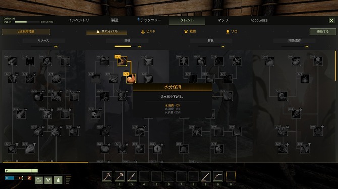 キャラクターがレベルアップすると「テックツリー」と「タレント」2種類の異なるポイントを割り振れます。「テックツリー」はアイテムの設計図をアンロックでき、床や屋根といった建築素材、調理や製薬用の生産台、各種武器などある程度ツリーが分かれています。もう一方の「タレント」はさらに「サバイバル」「ビルド」「戦闘」の3ジャンルが用意されており、最大HPの上昇、インベントリにある食物の腐敗スピード低下、自分で作る弓の耐久度UPといったキャラクター個人の能力値に関わる能力を育成可能です。Steamフォーラムの投稿によれば現状レベルキャップは60が上限で全設計図・タレントを1人で習得することはできません。マルチプレイの醍醐味でもありますが、事前にキャラクター育成の方向性を決めてポイントを無駄遣いせず、プレイヤーがお互い融通しあうのが理想のプレイスタイルと言えそうです。