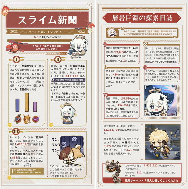スライム新聞は、パイモンがゲーム内のあらゆるデータを調べ、それを新聞形式にして紹介するコンテンツです。今回はイベント「華やぐ紫苑の庭」や、新マップ「層岩巨淵」での出来事に注目。