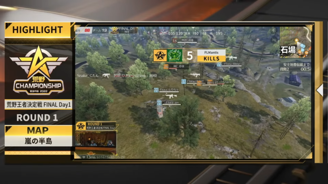 1日目のMCは柴田将平さんが担当、解説はV3さん、実況はBockyさん、ゲストは仏さんとなりました。お馴染みの「荒野行こうや!」の掛け声でラウンド1がスタート。マップは嵐の半島、横の航路で北寄り、安全地帯はマップ右上という形で始まったのですが、降下時から右上に各パーティが集まってきており、激しい戦闘が繰り広げられます。