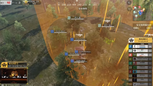 序盤こそ物資や車両の確保に併走する姿が見られたものの、安全地帯の収縮第2段階目あたりから早くも1チーム、2チームと徐々に欠けはじめ、第4段階の収縮あたりから混戦の様相。最後は最終局面まで5人で生存していたREXと、αD Aves、Sengoku Gamingの三つ巴に。