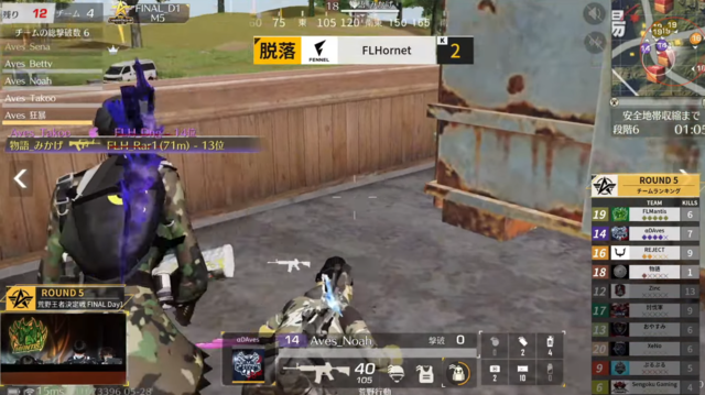 安全地帯の収縮第1段階で20名の選手が欠けることになり、第6段階になる頃にはαD Aves、FLMantis、REJECTが勝利を争う流れに。最後はαD Avesを殲滅したところで、秋穂選手しか残っていなかったREJECTを倒しFLMantisがラウンド5を獲得。