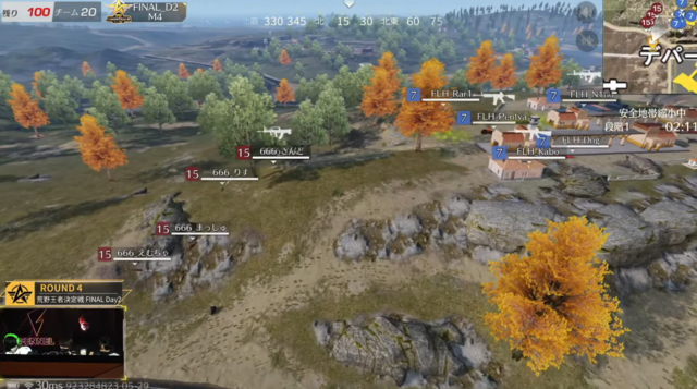 ラウンド2激戦野原では、やはり展開が激化したせいか、安全地帯収縮第4段階で53名15チーム生存という各チームのメンバーに欠けが目立つ状況。
