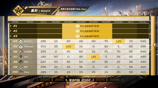 ここまで良い成績を残せていなかったREJECTが、アグレッシブな立ち回りを見せていたことが見どころに。第1段階収縮からキルポイントを狙っていることが見て取れ、それがどんな結果をもたらすかも注目でした。
