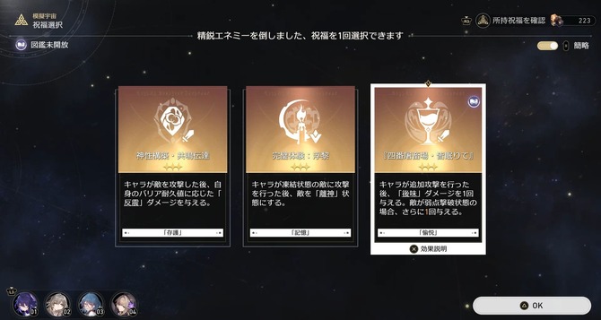 『崩壊:スターレイル』では、その奥深い戦略性をいかんなく発揮するローグライク的なコンテンツ「模擬宇宙」もプレイ可能。ここではランダムで発生するバフを組み合わせながらの戦闘シミュレーションを楽しめます。人によってはストーリーそっちのけでハマってしまう危険性もあるかもしれません!
