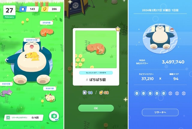 同じような睡眠タイプを持つポケモンをリサーチし「ポケモン寝顔図鑑」の完成を目指すほか、カビゴンの持つ「ねむけパワー」を高め、より珍しいポケモンの寝顔を集めます。