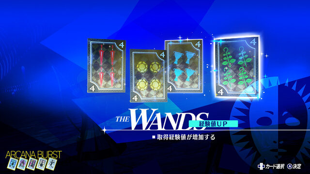 また、稀に「大アルカナカード」も出現。それぞれ「取得経験値増加」や「総攻撃で与えるダメージ増加」など固有効果があり、取得すればその日の探索中は常に効果を発揮します。
