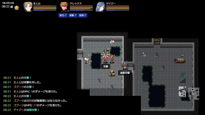 登場するすべてのキャラクターにステータスがあり、それぞれが意志をもって思い思いに行動します。フィールドや住人、冒険者、ダンジョンがゲーム毎にランダム生成される他、多彩な装備品はランダムな性能を持っており、プレイする度に新鮮な冒険を体験可能です。