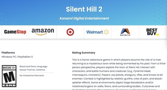 EntertainmentSoftwareRatingBoard(ESRB)は、リメイク版『SILENT HILL 2(サイレントヒル2)』のレーティングを公開しました。