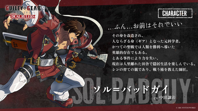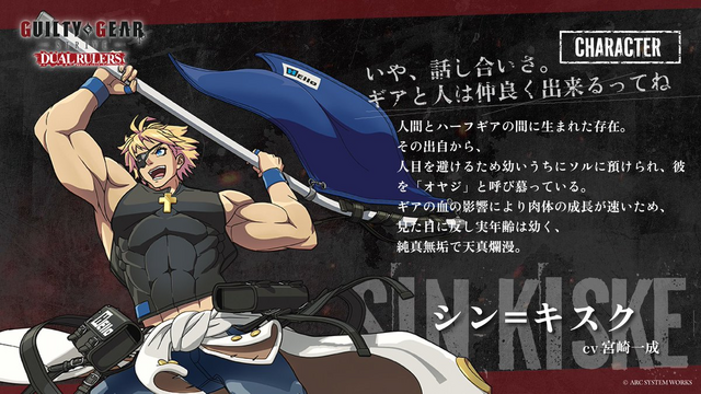 本作の主人公であり、人間とハーフギアの間に生まれた存在である「シン=キスク」役は、ゲーム版でも同役を演じた宮崎一成さんが担当。またシンの育ての親であり、戦う術を教えた師匠である「ソル=バッドガイ」役も、ゲーム版に引き続き中田譲治さんが担当します。