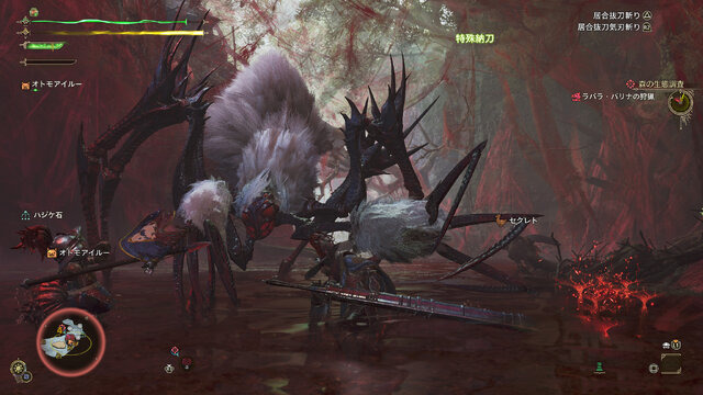 特に印象に残ったのは鋏角種「ラバラ・バリナ」。薔薇の花を背負った蜘蛛のようなそのビジュアルは、登場するフィールド「緋の森」の妖しい深紅の色味と相まって美しく、生物的な美しさを感じます。と、見とれているといじわるな攻撃で伸されるのがシリーズの醍醐味ですが、ラバラ・バリナも例に漏れず、まき散らす赤い胞子のようなゆっくりと落ちる攻撃に麻痺したり、長い脚を用いた機動力のある攻撃に翻弄されたりと、新たな出会いに感謝。