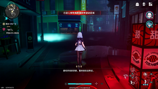 前項の最後で少し触れましたが、こんな平和そうに見える町中でも、人気の少ない特定の箇所を歩いていると、異象が発生してモンスターが出現することもあります。異象発生時は画面左上のマップがレーダーのような反応を見せ、辺りの様子が一変します。