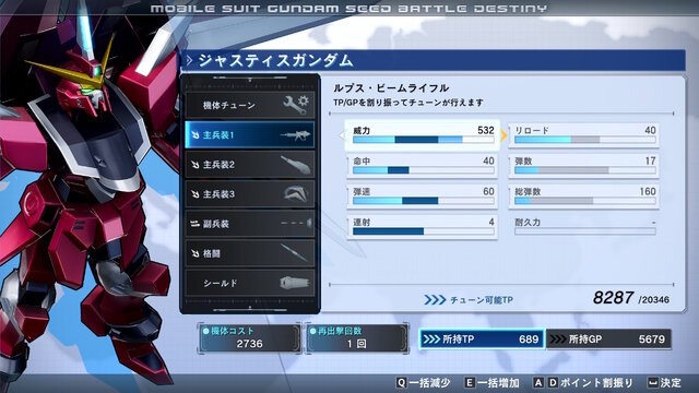 兵装のチューンでは、弾速やリロードを強化して射撃で圧倒したり、威力や命中を強化して格闘で制圧したり。自身の戦略やミッションにあったチューンを施しましょう。