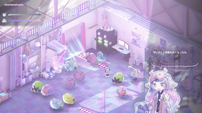 プレイヤーはメメメを操作してヒツジをつかんで窓まで運ぶと、ヒツジはふわふわと空へと飛んでいき、カワイイポイントが獲得できます。ポイントを利用してヒツジの生産施設を作ったり、施設の強化ができたりするほか、合体ヒツジやヒツジを追い立てる犬ロボなど発明して、半自動化させていくミニオートメーション要素があります。