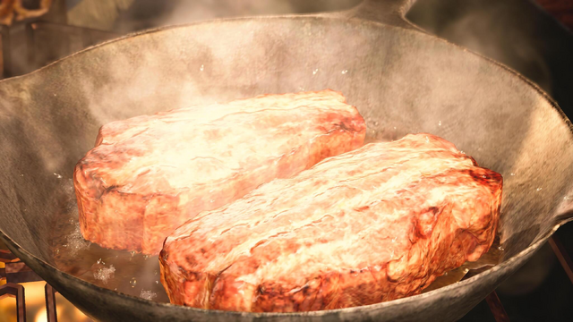 余計なものが一切ない、肉々しさ極まる料理ですが、口にした時の満足感は狩りの疲れが吹き飛ぶほどです。濃厚な脂とバターは舌が溺れるほどにジューシーですが、飢えた喉が瞬く間に飲み干し、次の肉をと声なき叫びが上がります。