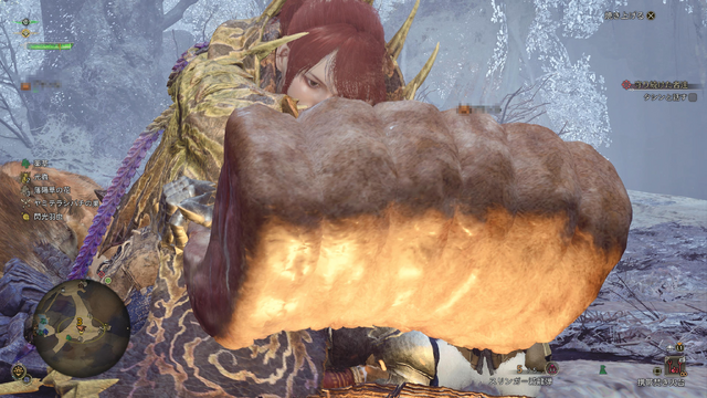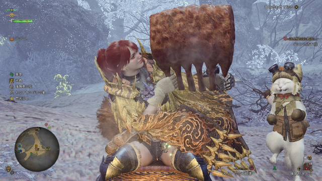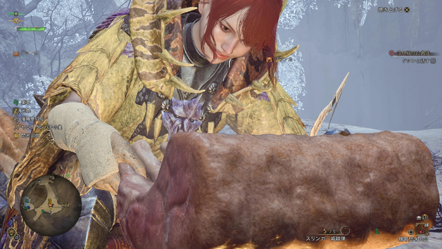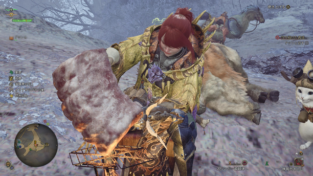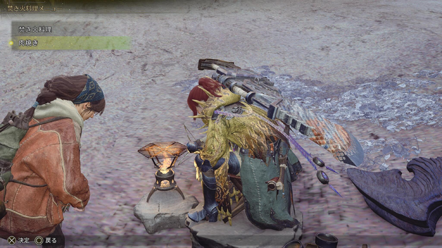 この調理は場所を選びませんし、食材が調達しやすいのも嬉しいポイントです。狩りたての肉を手に入れれば、あとは携帯焚き火台で十分焙るだけ。食材となる部位はハンターであっても片手で持つのは苦労するほどのサイズ感なので、これを両手で持って火を通す様はそれだけで圧巻です。