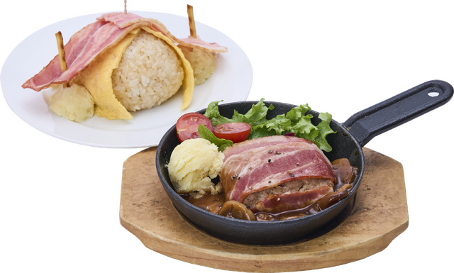 オトモアイルーをイメージしたハンバーガープレート。仕上げにチーズをたっぷりとかけ、まるでアイルーのようなふわふわな毛並みの食感を演出。見た目も楽しく、食べれば満足感たっぷりの一皿です。