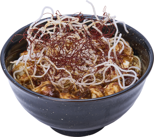 ラバラ・バリナを表現した麻婆豆腐ラーメン。ラバラ・バリナの赤と白の綿毛を彩り鮮やかな糸唐辛子とサクサクの揚げ春雨で表現した、見た目も華やかで食欲をそそる一杯です!