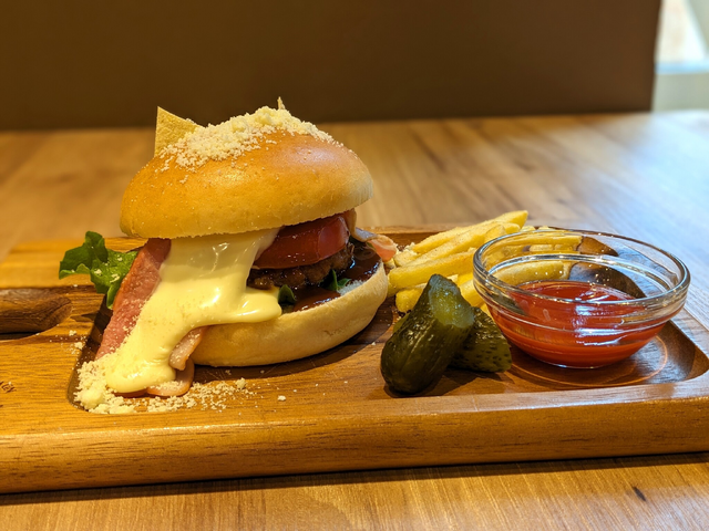 オトモアイルーのハンバーガープレート」は見た目のインパクトも強く、肉厚なパティや厚切りのトマトによって食べ応えは抜群。さらにはベーコンとたっぷりかかったチーズもサンドされており、付け合せのポテトやピクルスも相まって大満足のボリュームとなっています!