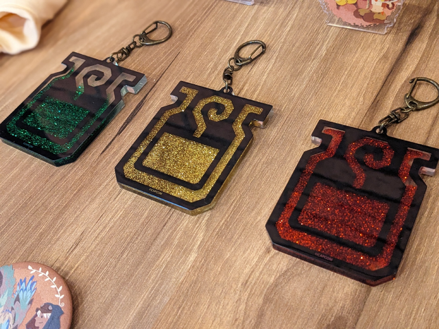 このほかコラボメニューだけでなく、オリジナルのコラボグッズも展示されていました。デフォルメされたイラストが可愛いキーホルダーやバッジをはじめ、アイテムのアイコンやクエスト画面を再現したキーホルダーも登場。