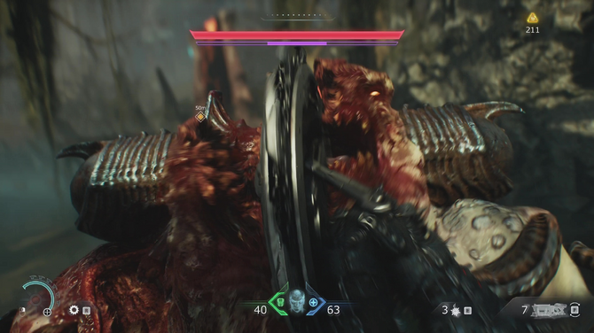 そして、シールドといえば「パリィ」も大事。「パリィは敵の攻撃を待ってしまうから、『DOOM』のハイスピードアクションとは相性が悪いのでは?」という懸念を抱く人もいるかもしれません。しかし、そこもちゃんと考えてあるのが本作。パリィはすべての攻撃ではなく、緑色のエフェクトがかかった一部攻撃にのみ可能となっており、近接攻撃をパリィすると少しの間よろめきが発生、遠距離攻撃をパリィすると弾を跳ね返してダメージを与えるといった報酬があります。