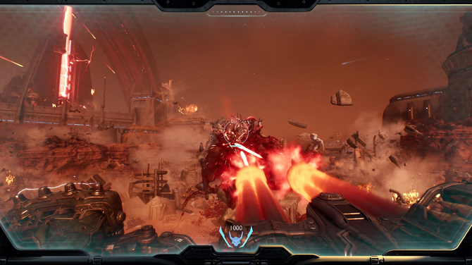 ドラゴンパートでは、サイバーな赤い羽根をつけたメカメカしいドラゴンに乗り、銃を撃ちながら空を飛んだり浮遊船と戦ったりします。建物や岩場の隙間をスイスイとくぐっていく感覚はこれまでの『DOOM』にはなかった感触で、とても新鮮に感じられます。