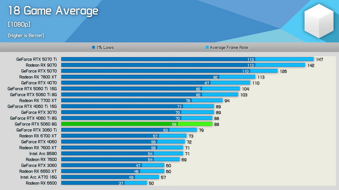 検証タイトルには『Clair Obscur: Expedition 33』や『The Elder Scrolls IV: Oblivion Remastered』が含まれており、解像度1080pの平均パフォーマンスを見てみると、1%Low fpsが68、平均fpsが88という結果に。前世代のミドルハイクラス「GeForce RTX 4060 Ti」とほぼ同じ、前世代のミドルクラス「GeForce RTX 4060」よりは22%高いパフォーマンスです。