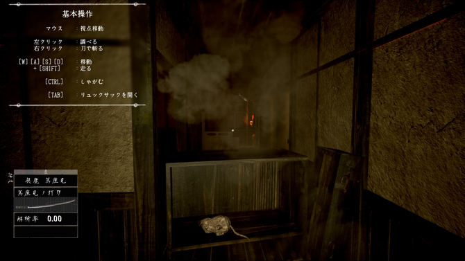 基本操作は、[マウス]で視点移動、[左クリック]で調べる、[右クリック]で斬撃、[WASD]で歩き移動+[Shift]で走る、[CTRL]でしゃがむ、[TAB]でインベントリを開く、といったオーソドックスなものです。