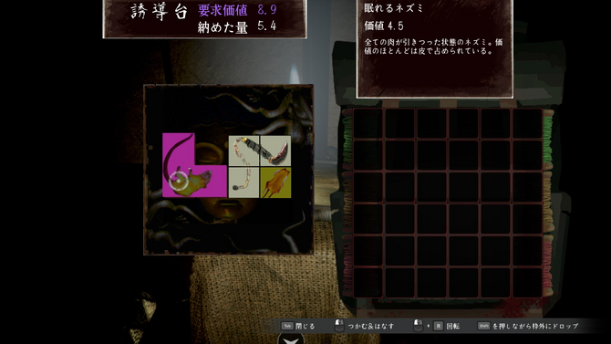迂回して別の部屋に行ったところ、「誘導台」という奇妙な供物台を発見。どうやら、この台に物を奉納するようです。マス目は縦2×横4の合計8マスですが、1マスだけ欠けている模様。それに、「要求価値 8.9」とか「納めた量 0」なども書いてあります。これに関してはとくに説明はなく、何が何やらわかりません。