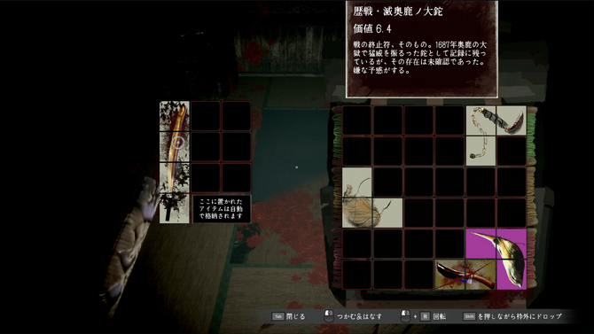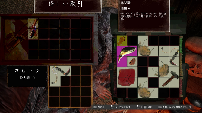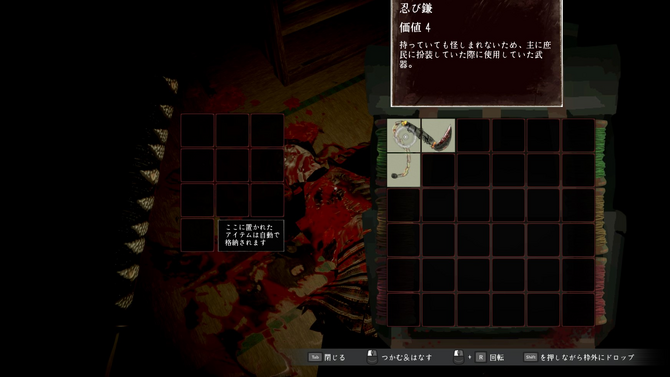 とりあえず古びたタンスの中や周辺を調べてみると、着物や忍び鎌、ネズミの死体といったアイテムを拾えます。それぞれに「価値=数字」が設定されています。
