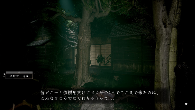 オカルト研究部の4人は、依頼を受けて「あるモノ」を探しに噂の武家屋敷へとやって来ました。けれども、霧が邪魔をして皆バラバラにはぐれてしまう事態に。プレイヤーは残りのメンバーと合流して、さらに「神具」を見つけ出さければなりません。