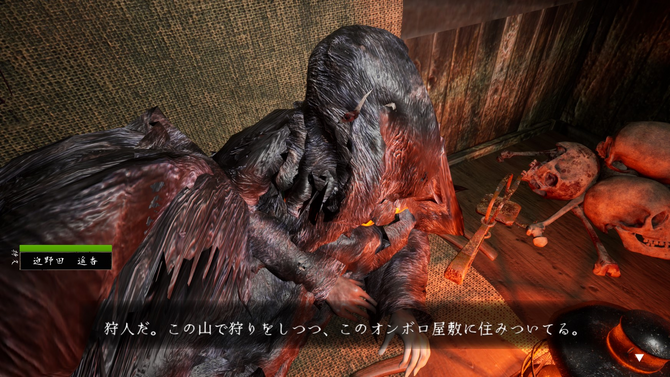 …ではなく、彼はこの屋敷に住み着いている「狩人」という人物。どうやら、山で狩りをしつつ生活しているらしく、狩猟道具や捕れたての肉などを交換してくれるとのことです。