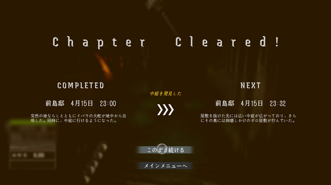 そしてチャプターも無事クリアしひとまずは安心。この先、どのような展開と結末を迎えるのかは、ぜひともプレイヤー自身が体験して欲しいと思います。
