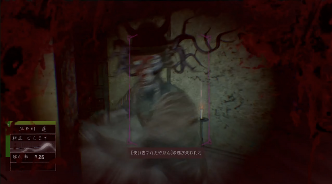 とりあえず、屋敷の中を進んでいきましょう。血しぶきが飛散する障子、薄汚れた土壁などボロボロの廃墟みたいな雰囲気がめちゃくちゃ怖い。しかも何やら騒々しく、誰かが争っている大きな音までもします。