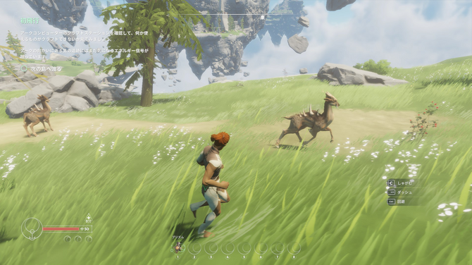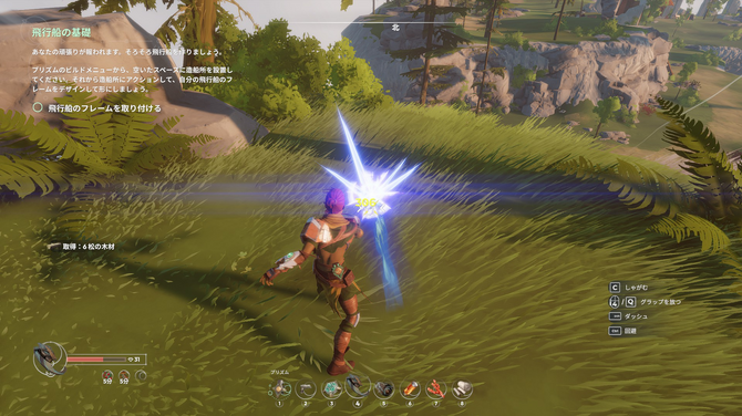 ゲーム内では移動用ツールの使用と、壁面を掴んで移動する組み合わせで、かなり厳しい斜面や崖も簡単に移動できます。最初の群島では移動や戦闘、採取、簡単な謎解きなどを覚えながら、最後に世界を冒険する鍵となるスカイシップの造船施設を設置するのが大きな目的です。