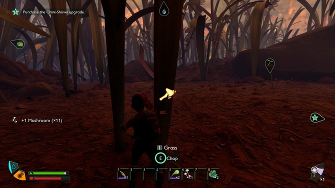 素材集めに便利なのが、本作に登場する新アイテム「オムニツール」です。このアイテムは、いわゆるクラフトサバイバルでの切る、砕く、掘る、直すなどのツールをひとまとめにしたもので、壊れない、インベントリを圧迫しないといった、さまざまな利点があります。