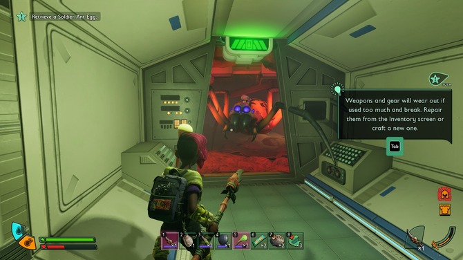 発見した素材は研究施設で分析することで、クラフトや建築のレシピを習得したり、オムニツールの強化やレシピの購入に使えるポイントを獲得できます。冒険、分析、強化、そしてまた冒険というのが、本作の基本的な流れです。装備が強化されれば、恐るべきサイズの虫達とも戦えるようになるでしょう。
