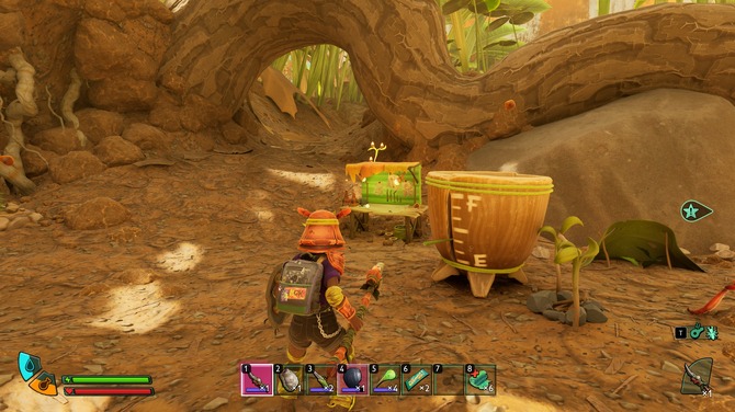 バギーに乗れば素早い移動やジャンプが可能で、行動範囲も広がります。さらに、バギー用のインベントリにアイテムを入れたり、インベントリに入らない大きな素材を大量に運べたりと、探索で欲しい要素をほとんど揃えてくれます。特に家を作る際に、葉っぱや茎などの大きい素材を一気に集められるのは助かります。